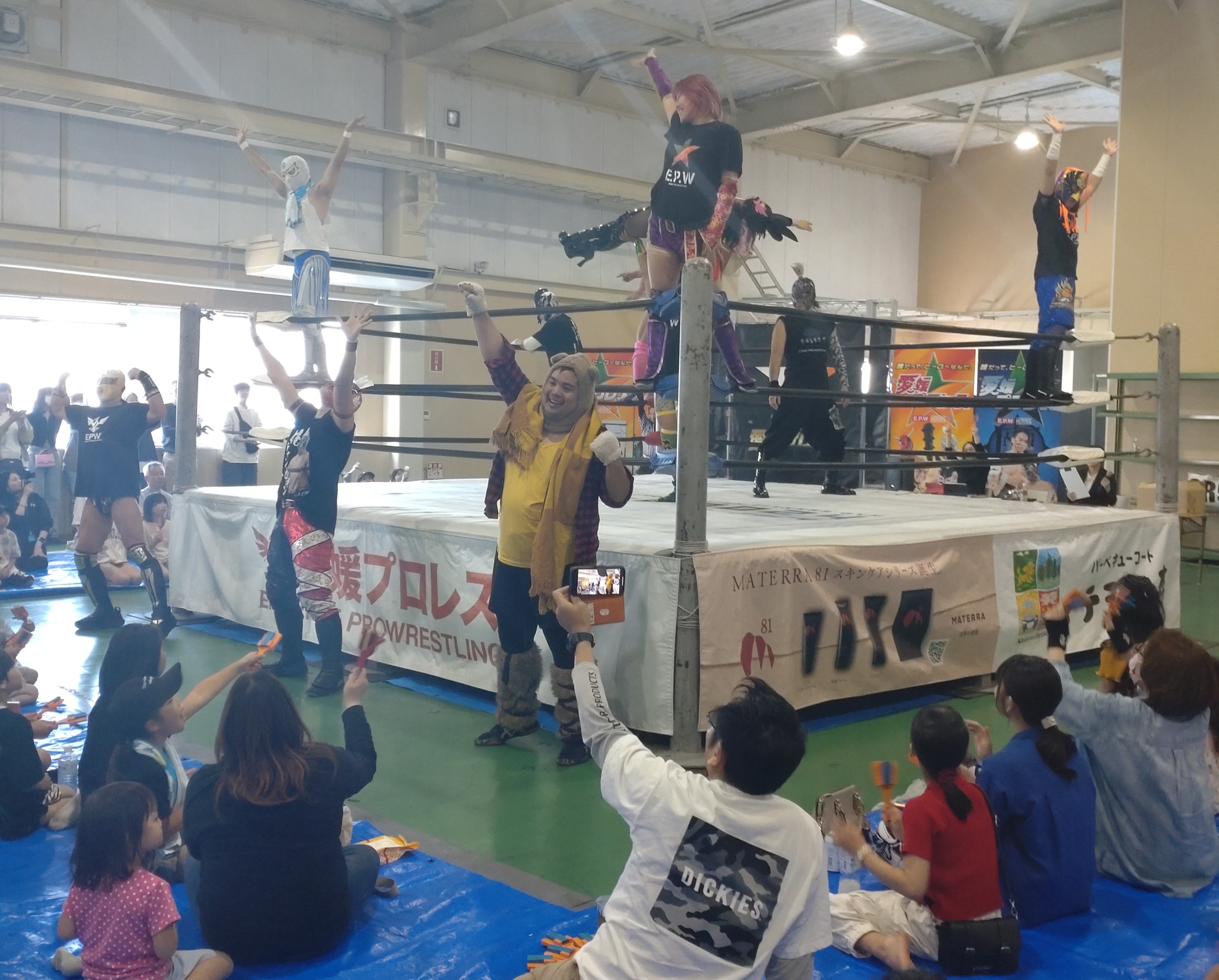 愛媛プロレスの皆様や松山市のよさこい連の皆様をお呼びしてのパフォーマンスもあり、多くの方に楽しんでいただいています。また、お子様が参加できるイベントとして、イントロクイズ、ミニ四駆作りとコースでの試走が楽しめる体験ブース、ドーム型エアー遊具、テレビゲームコーナー等の設置など、様々な遊びを催しています。
